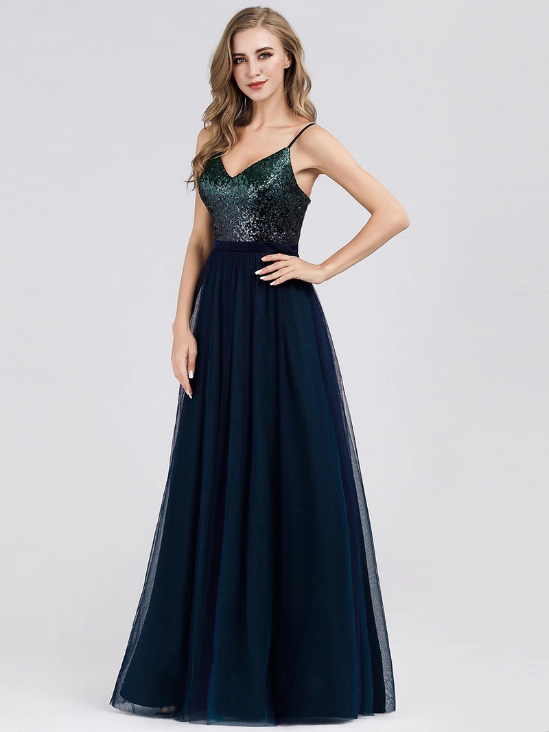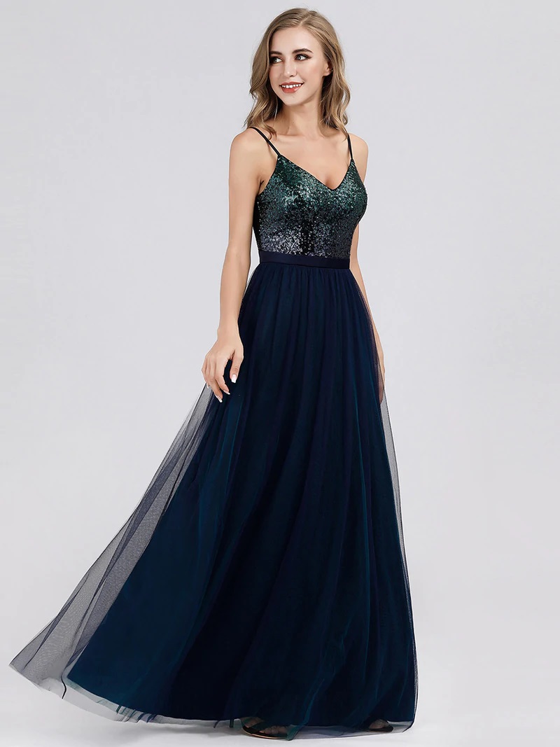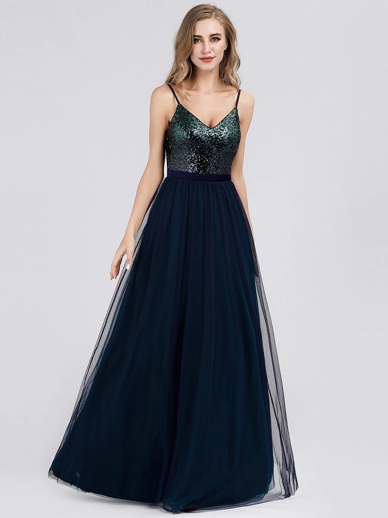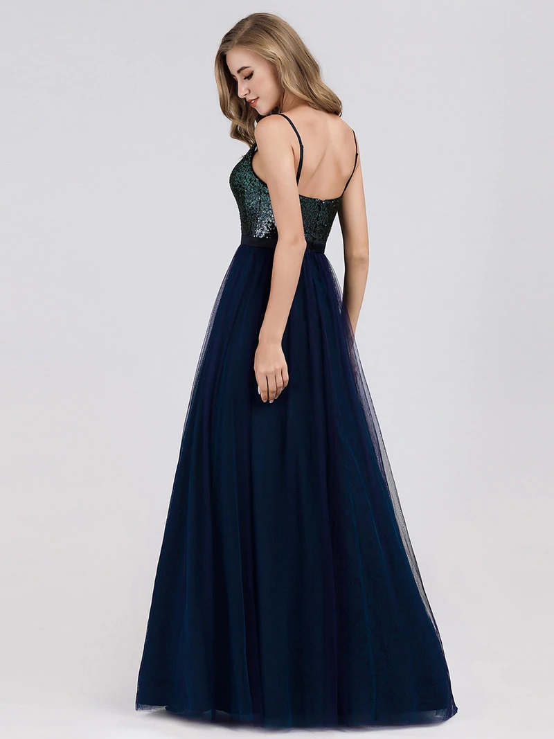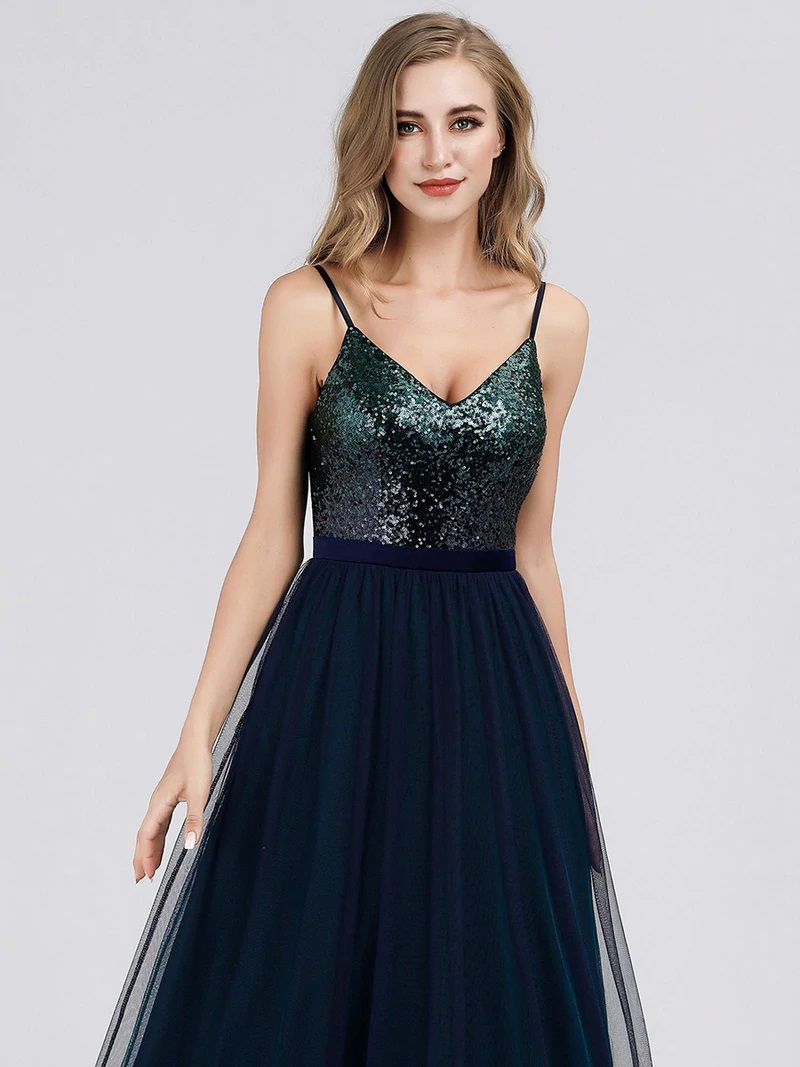 Tyto večerní šaty mají vypasované flitrové poprsí a splývavou tylovou sukni.