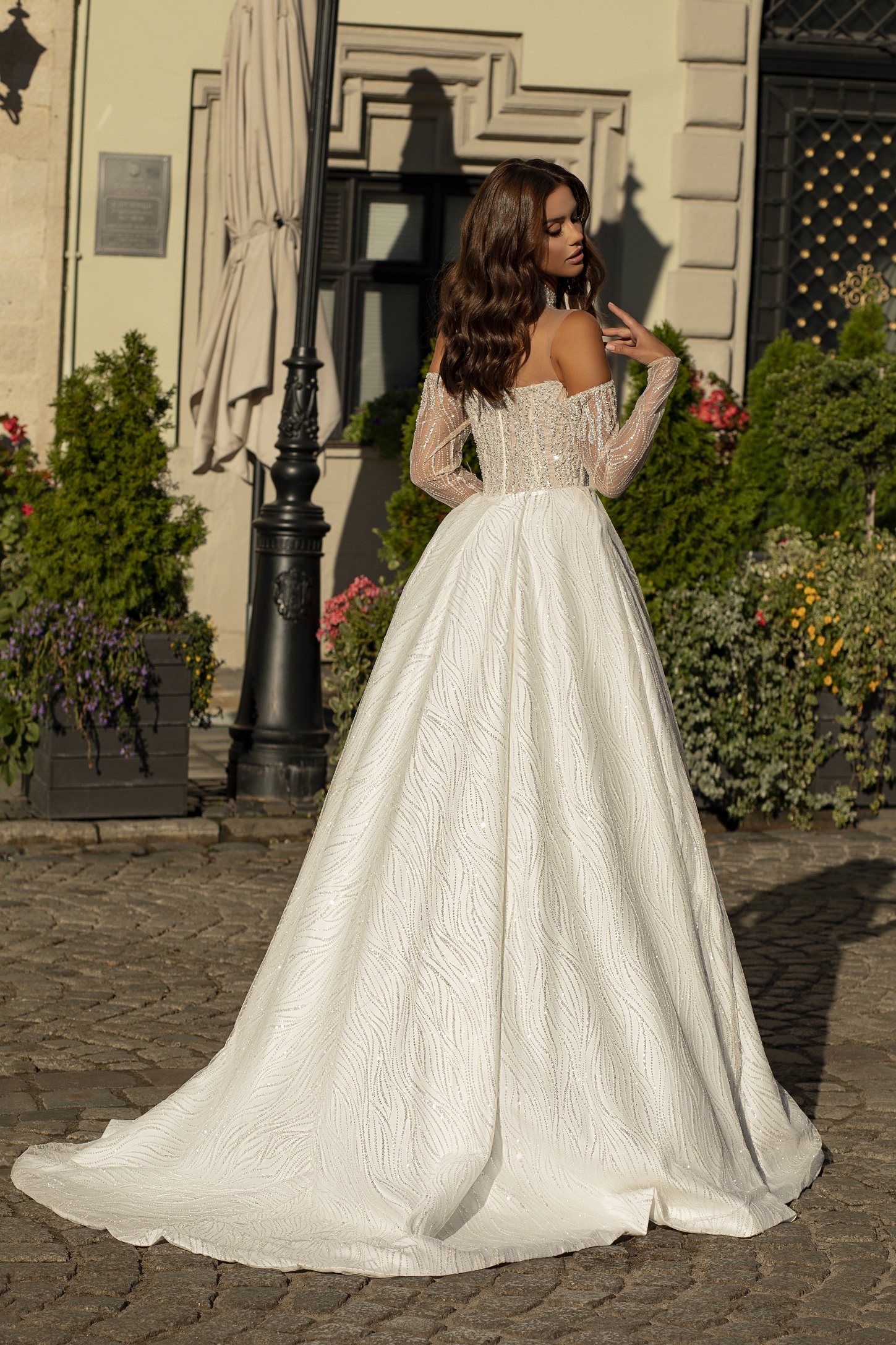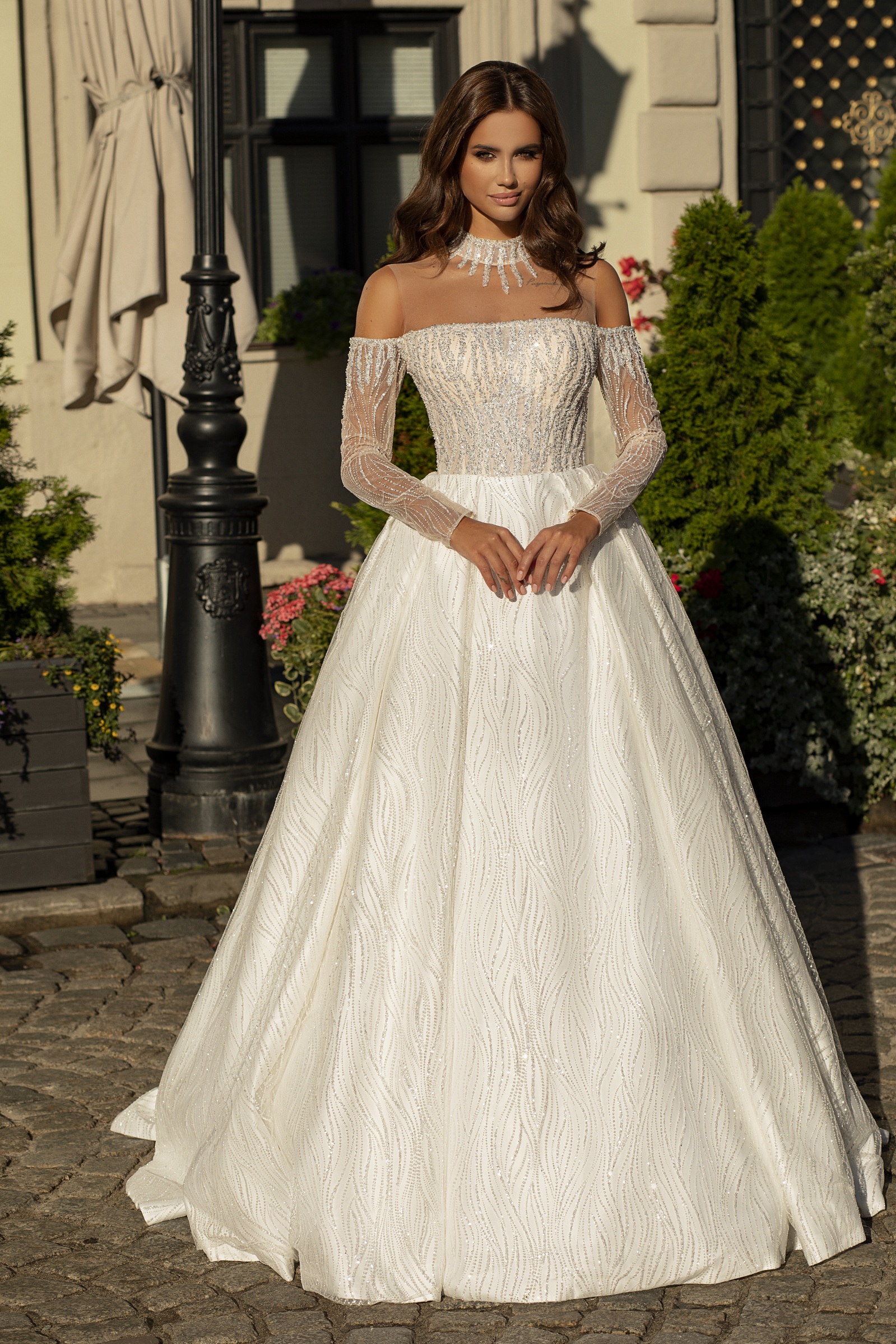 Šaty jsou vyrobeny z vysoce kvalitních materiálů a pyšní se jiskřivou plnou sukní. Jeho třpytivé detaily vytvářejí nezapomenutelný vzhled pro váš výjimečný den.