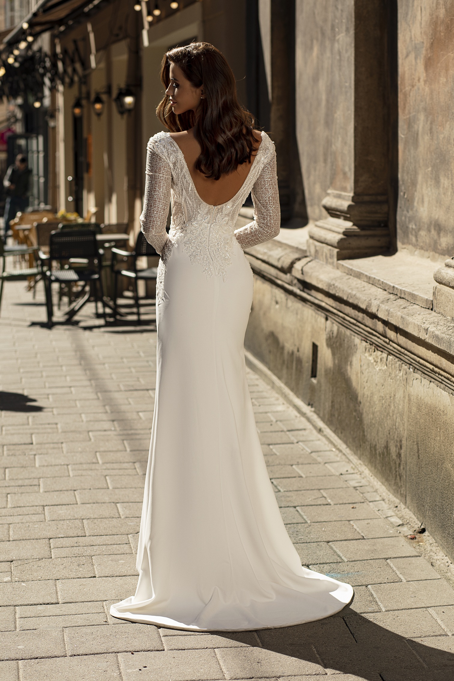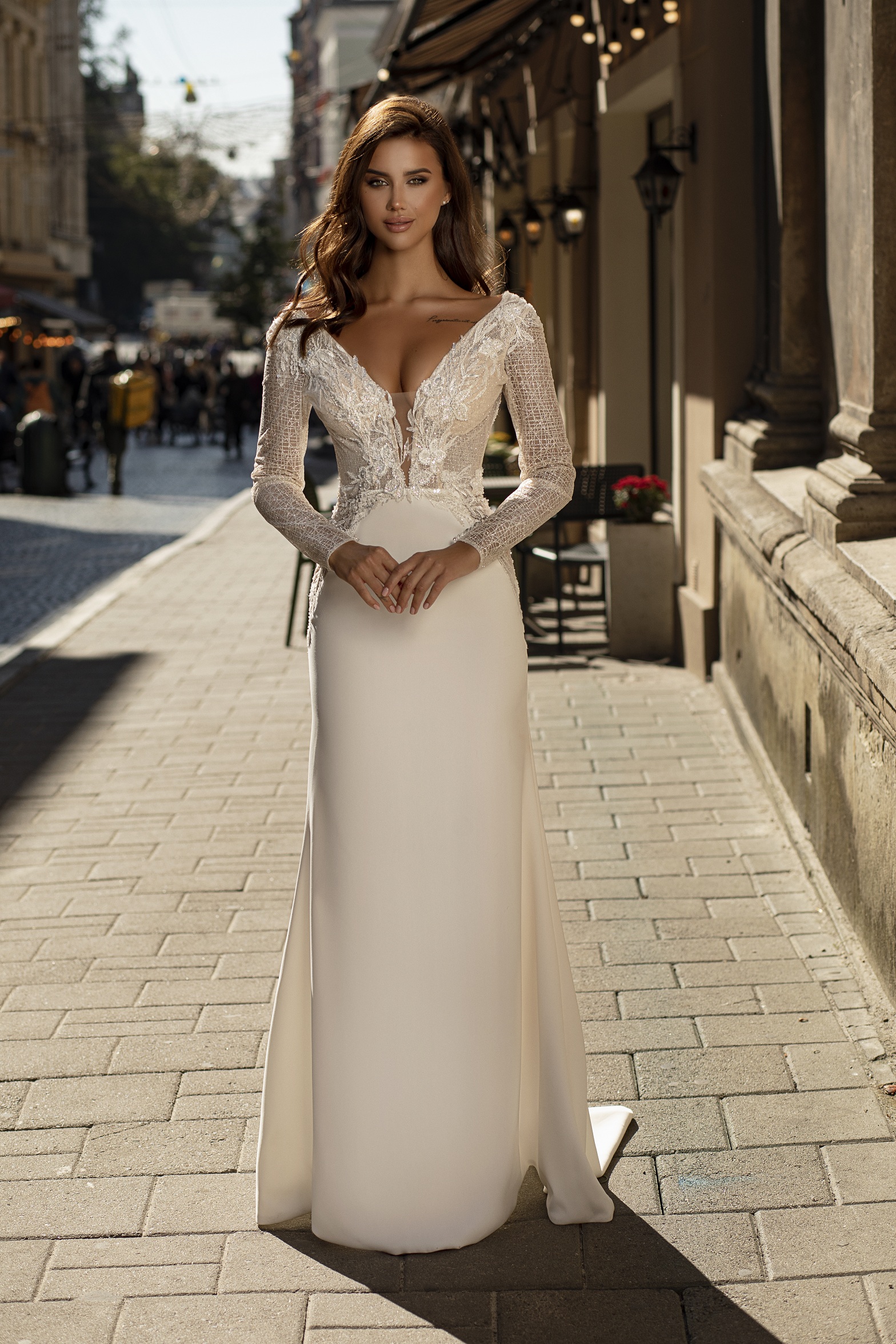 Šaty 915 mají vypasovaný design, který zvýrazní vaši postavu. Vlečka šatů dodává nádech dramatičnosti a při procházení uličkou je ohromující.