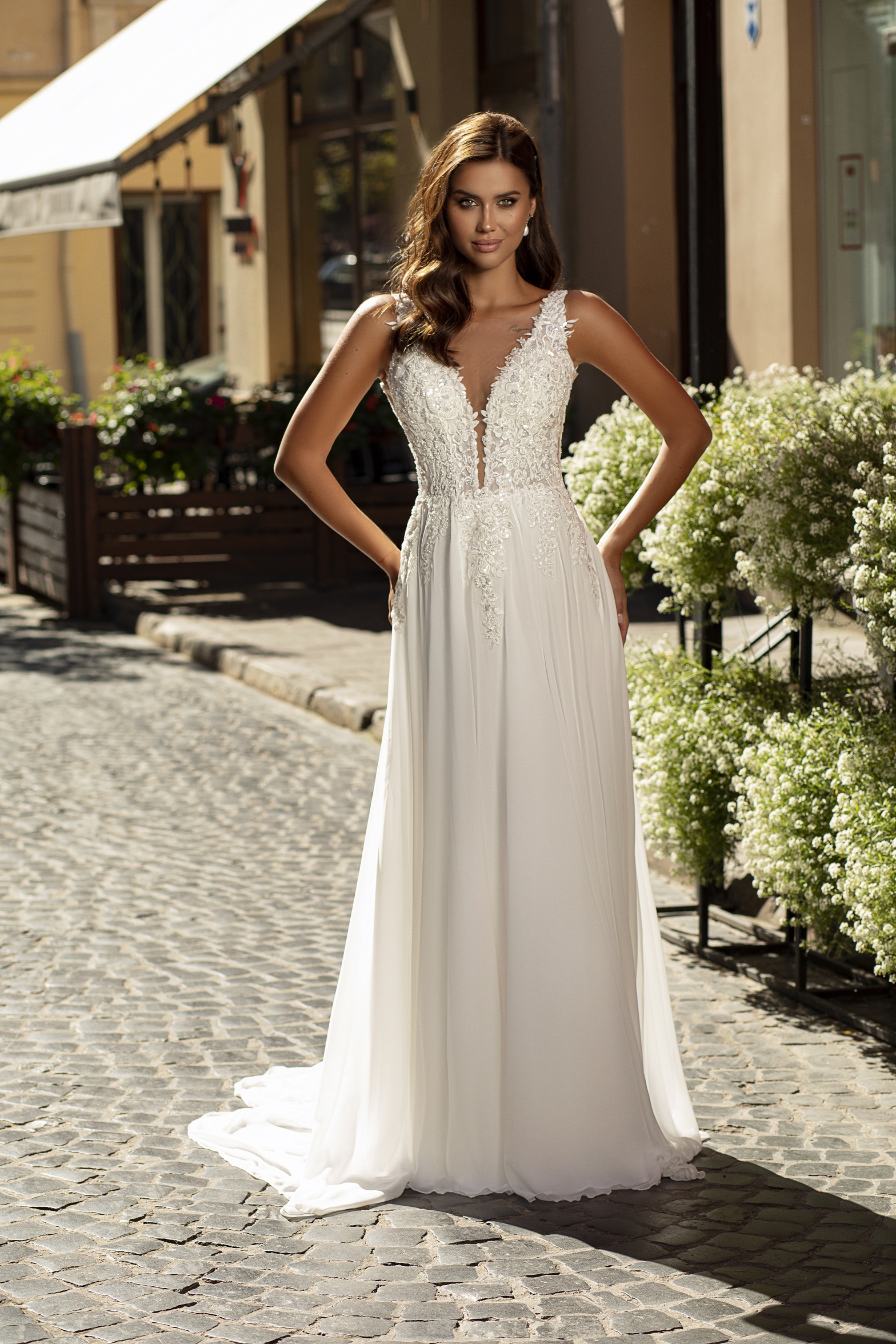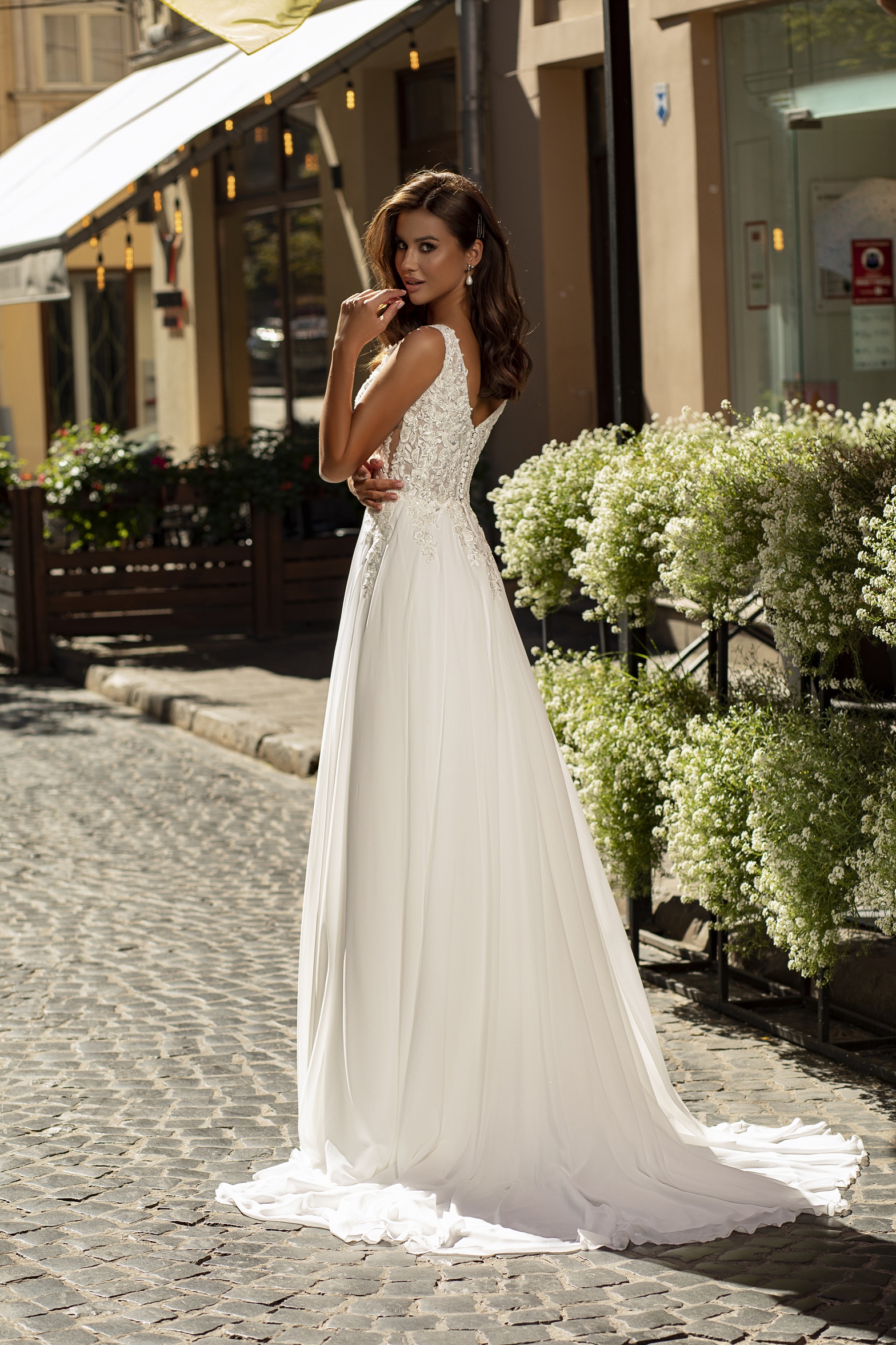Šaty 916 mají lehkou šifonovou sukni pro ladný pohyb. Průhledný korzet zdobený krajkou dodává na sofistikovanosti.