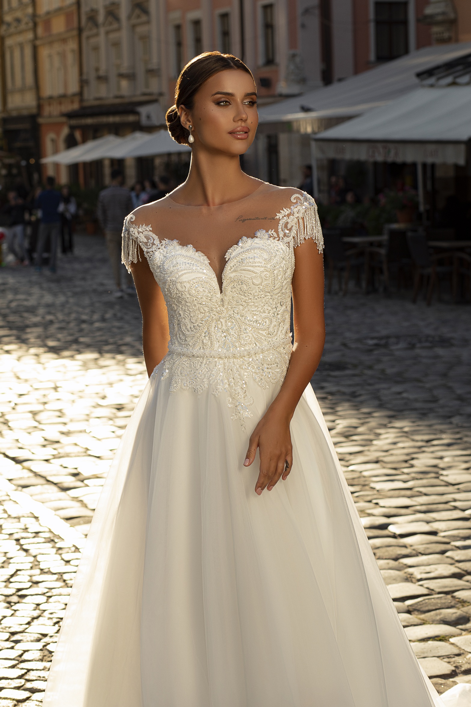 Objevte svatební šaty 925 ze svatebního salonu La KlauMa, kde ožívají pohádkové sny. Tato okouzlující róba představuje rozmarnou tylovou sukni a okouzlující vlečku a vytváří dokonalý vzhled pro váš nezapomenutelný svatební den.