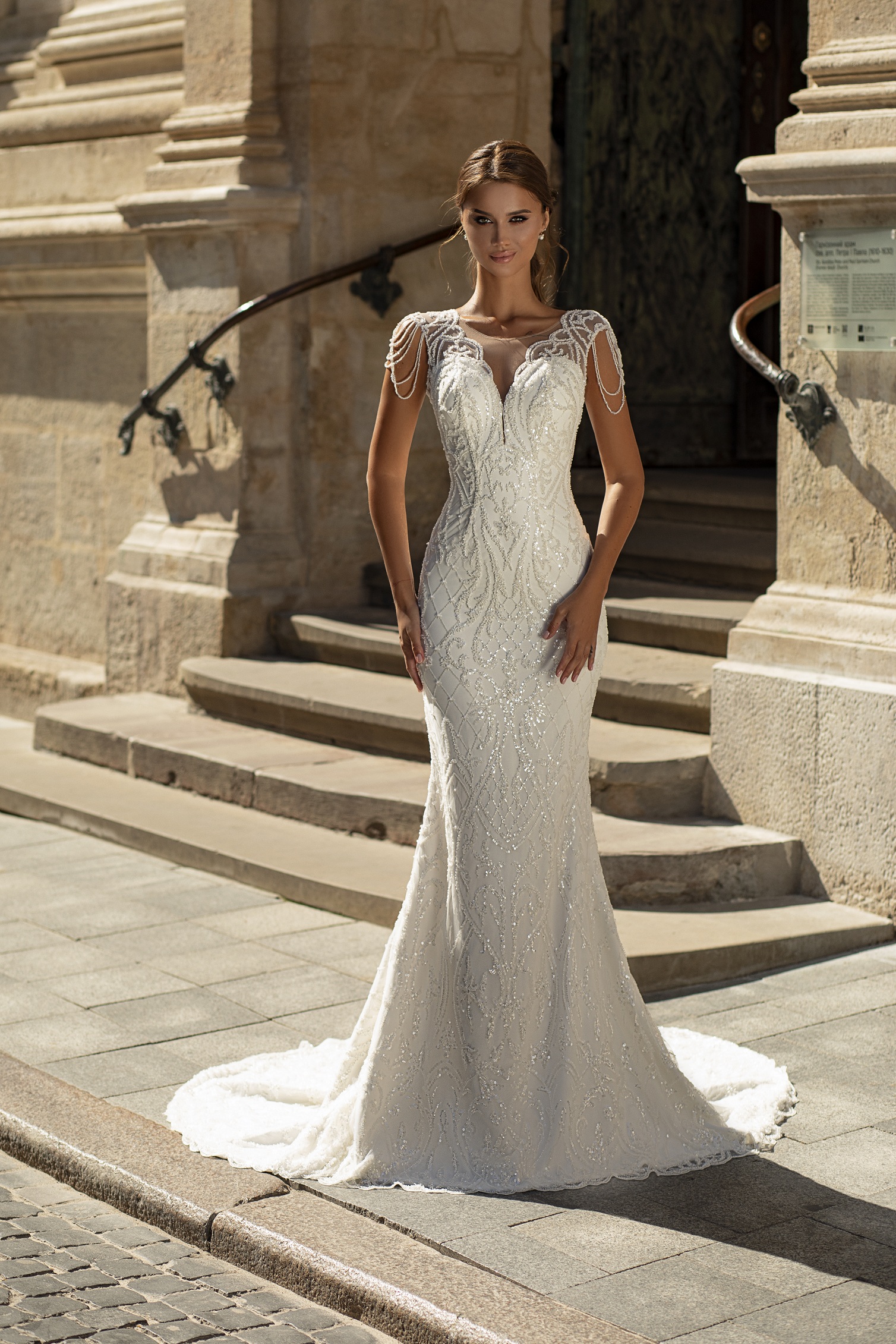 Šaty jsou na ramenou zdobeny korálky, které dodávají obrazu jedinečné kouzlo a jiskru. Silueta mořské panny dokonale padne na postavu, zvýrazňuje její kouzlo a vytváří nádherný obraz.