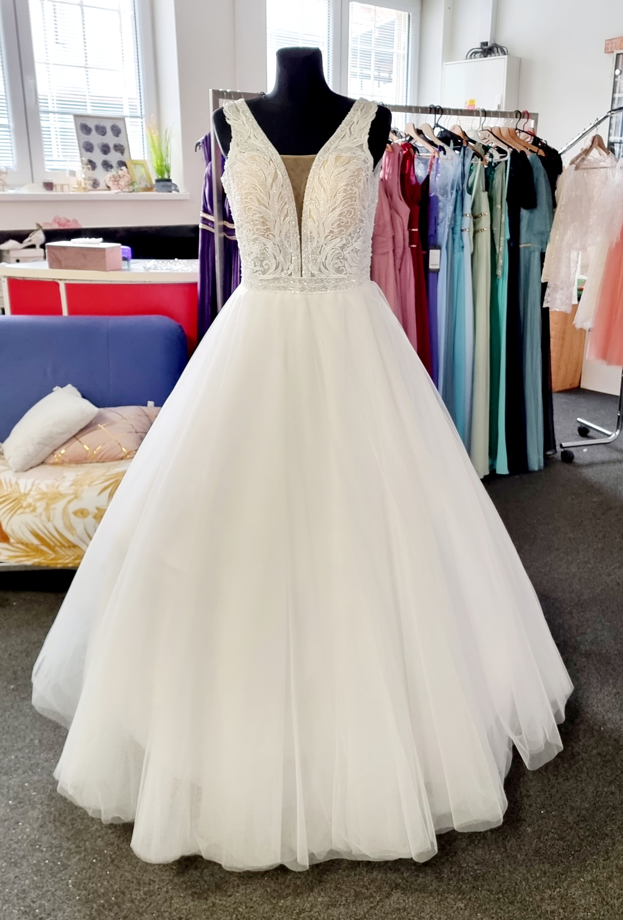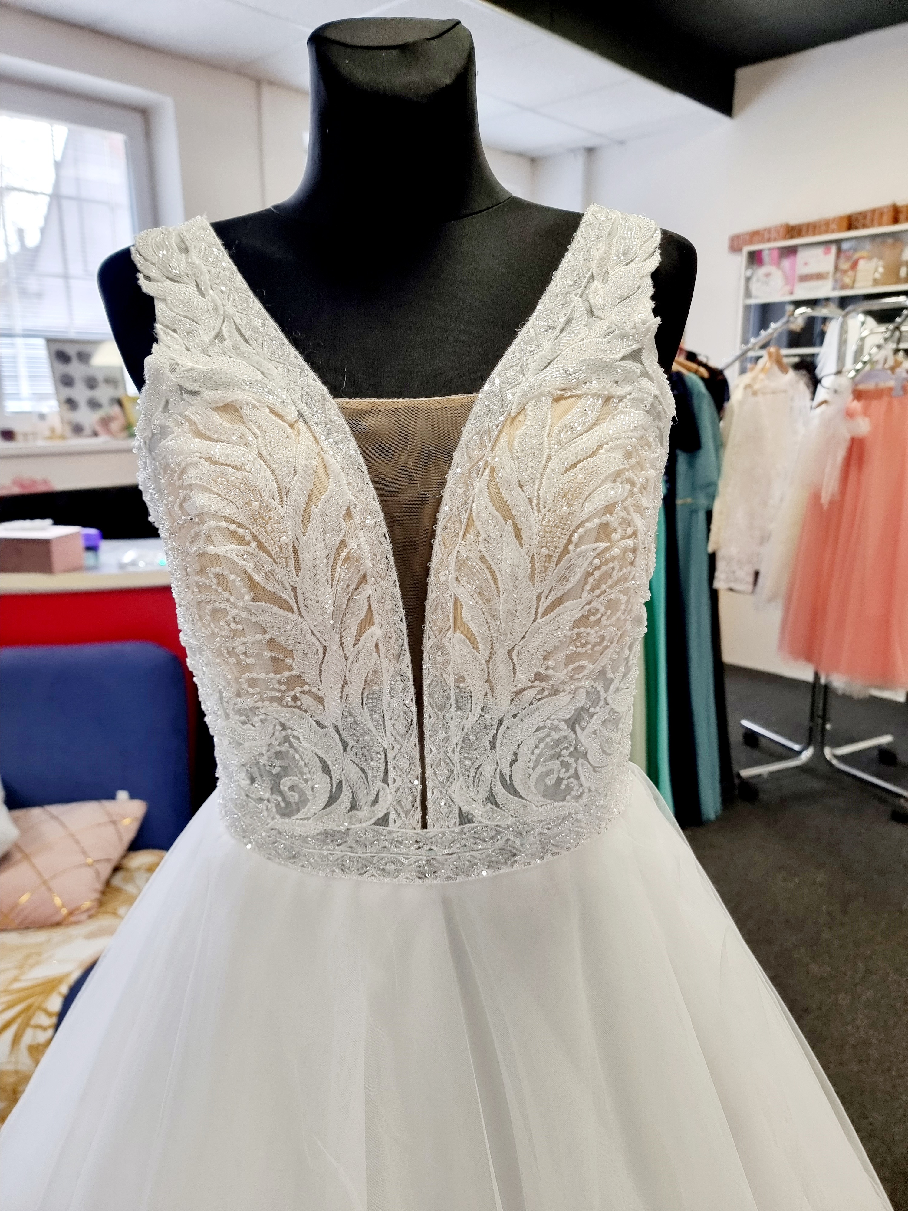 Šaty, které dokonale vystihnou Vaši krásu. Zdobený vršek s hlubokým výstřihem podtrhne výjimečnost těchto šatů a čistá třpytivá sukně jim dodá eleganci a čistotu.
