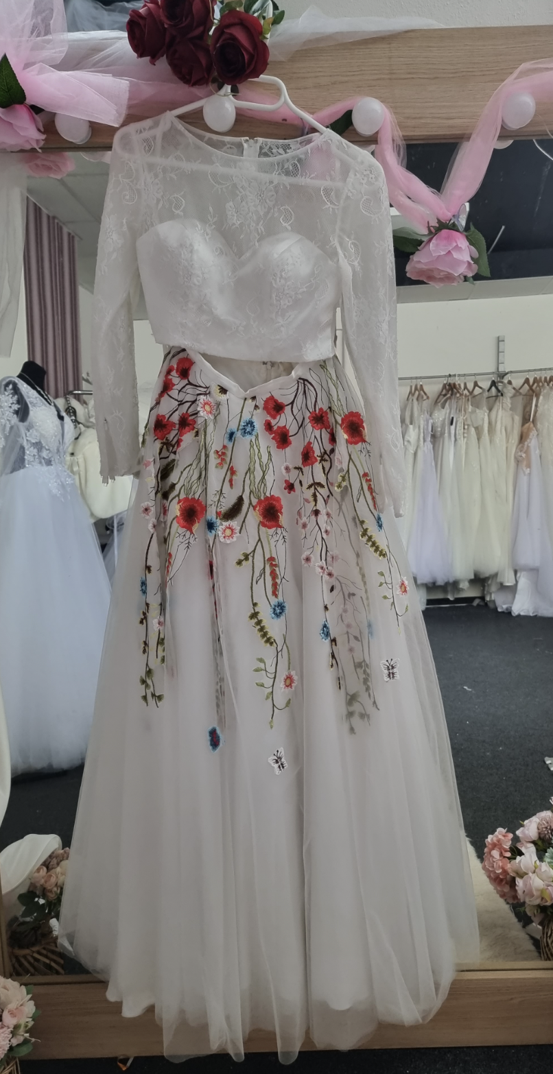 Výjimečné dvoudílné svatebni šaty s módními květinami, které najdete ve svatebním salonu La KlauMa v Mladé Boleslavi.
