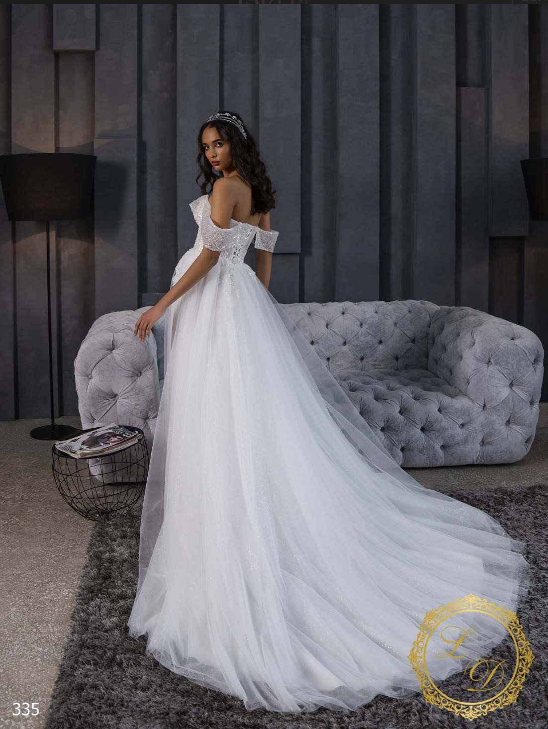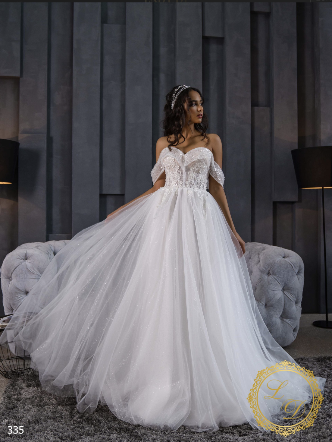 Něžné svatební šaty se spadlými rukávky a šnerováním, které najdete ve svatebním salonu La KlauMa v Mladé Boleslavi.