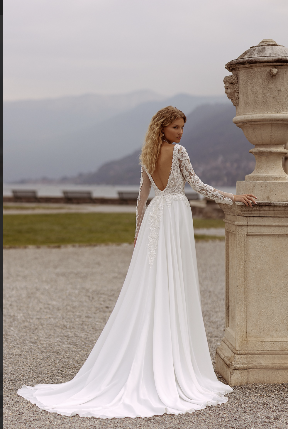 Rovnováha mezi přiléhavým korzetem a vzdušnou šifonovou sukní vytváří lichotivou a pohodlnou siluetu.