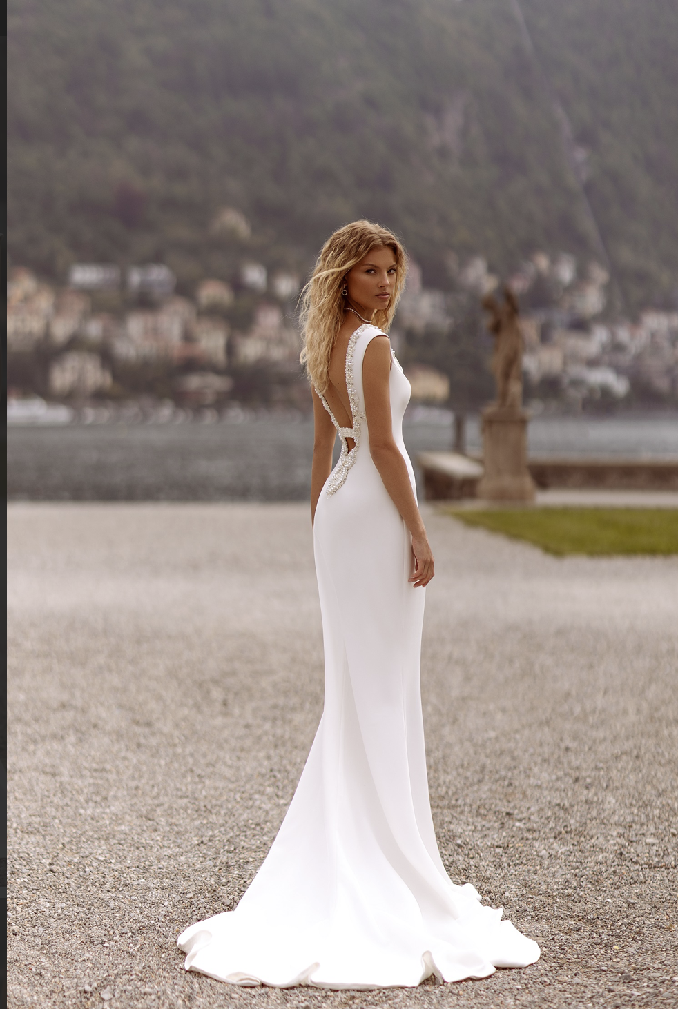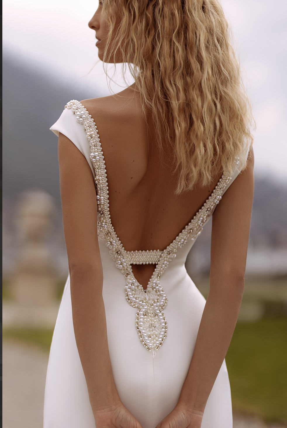 Tyto krepové šaty znamenitě navržené v siluetě mořské panny definují obrys vaší postavy, zatímco otevřená záda jí dodávají smyslné kouzlo.