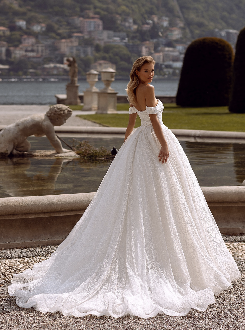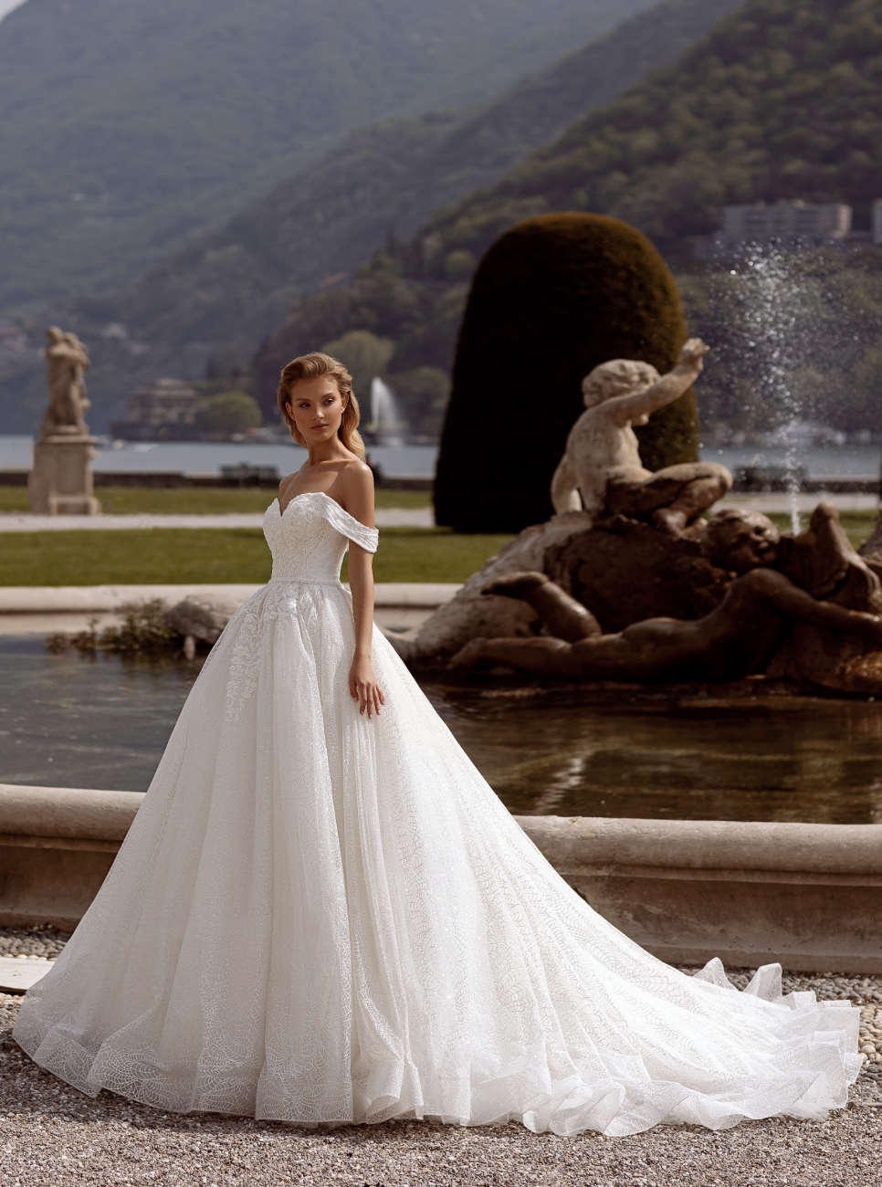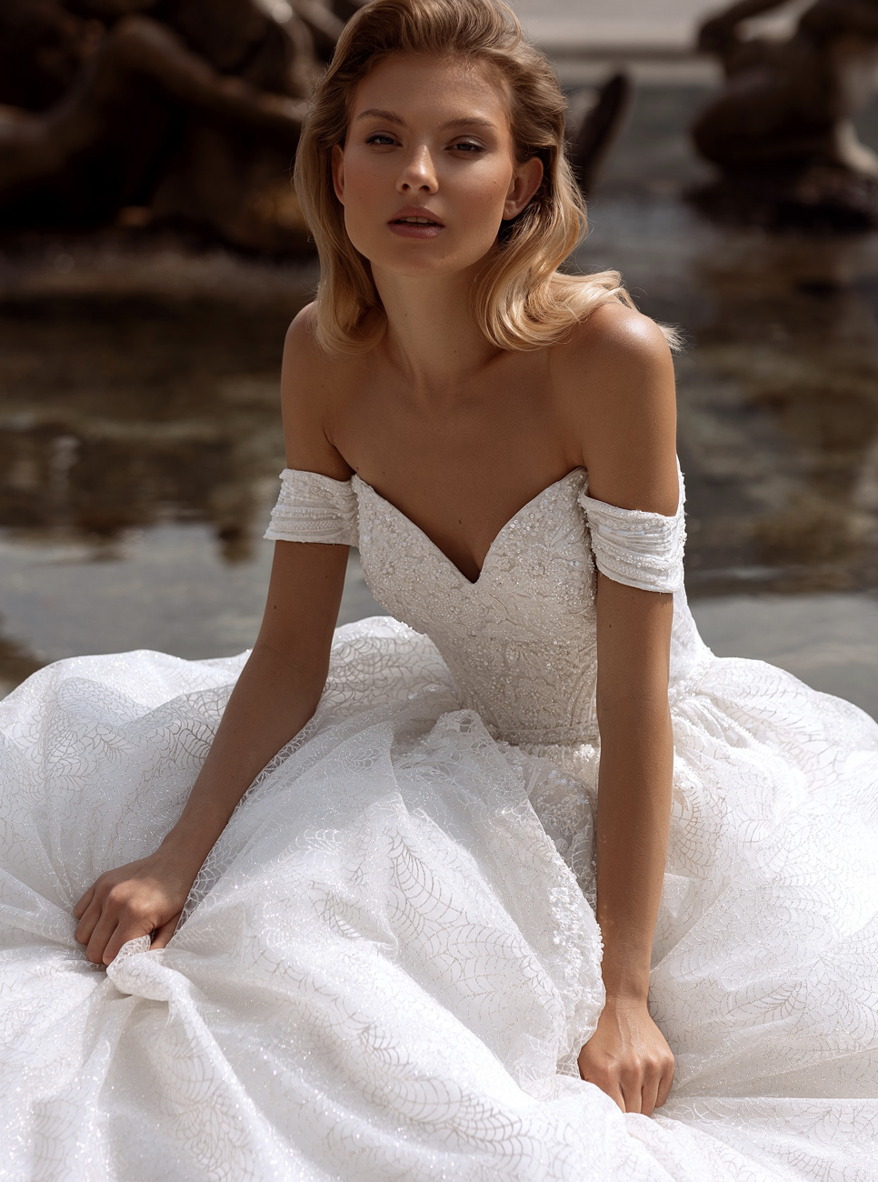 Tyto šaty ušité s přesností a vášní jsou důkazem odhodlání vytvářet luxusní a jedinečné svatební oblečení. Jeho složité krajky a korálkové ozdoby dodají vaší pohádkové svatbě nádech kouzla.