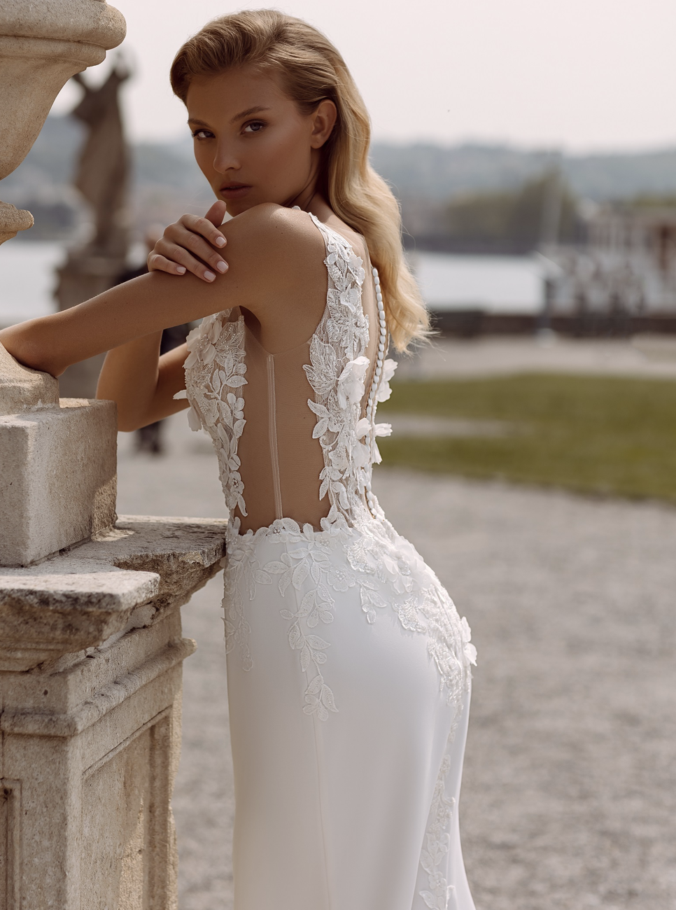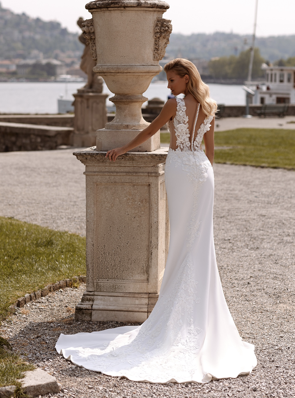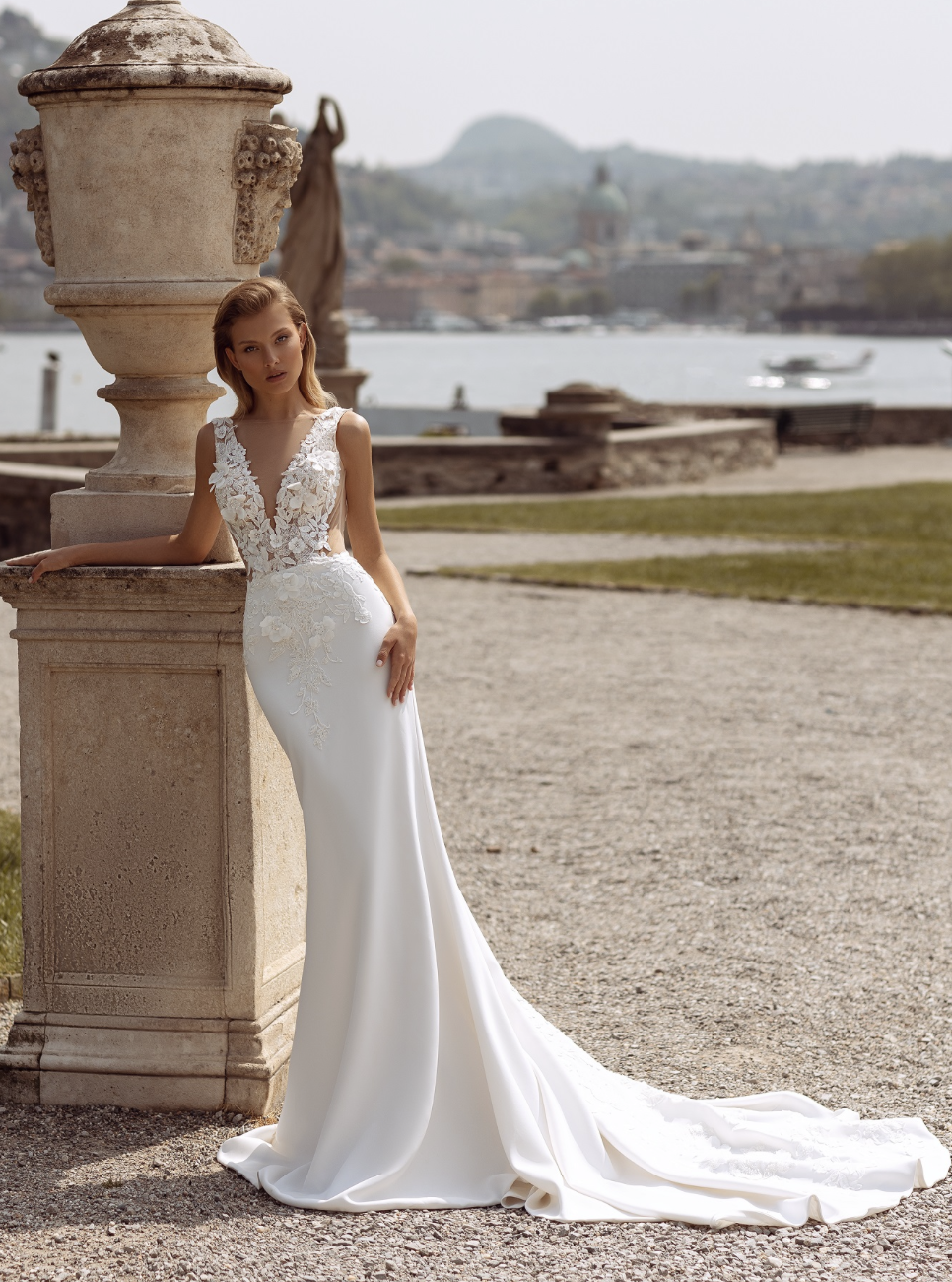 Tato půvabná silueta mořské panny je nádherně zdobena jemnou květinovou krajkou, která přechází do královského vlaku a zachycuje podstatu nadčasové romantiky.