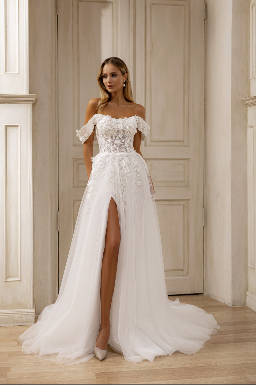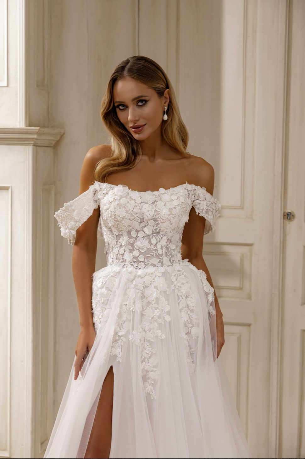 Šaty s krásným výstřihem mimo ramena zdobí jemné květinové krajkové aplikace, které jemně splývají po živůtku a vytvářejí sladký a romantický tvar.