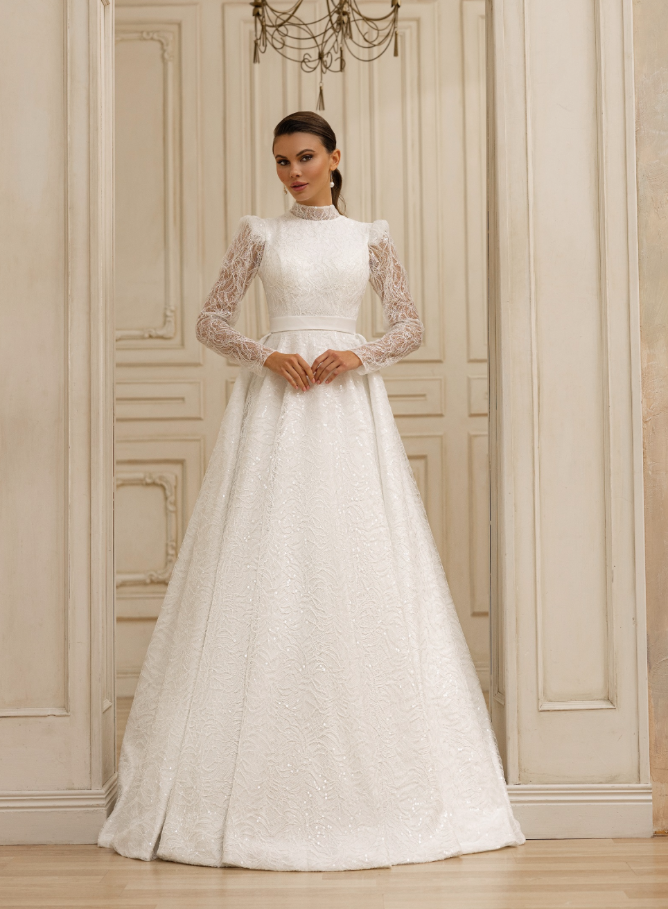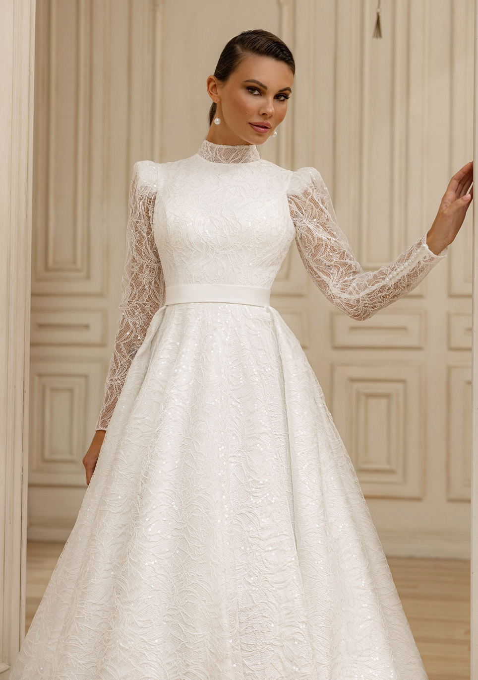Vysoký výstřih začíná nahoře a dodává nádech skromnosti a sofistikovanosti. Je to elegantní vzhled, který krásně orámuje váš obličej.