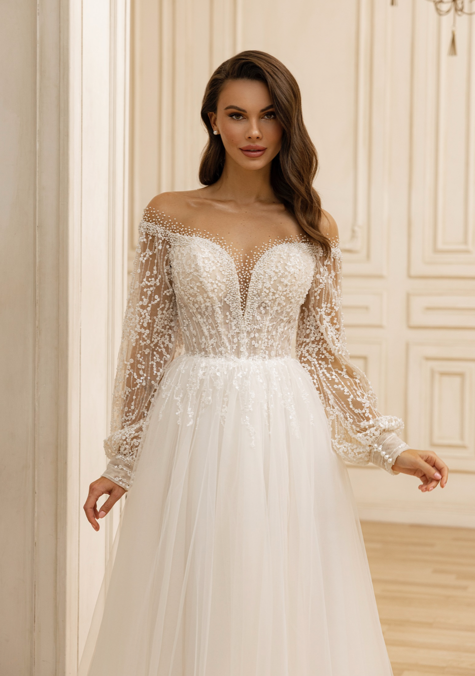 Drobné perličky zdobí výstřih a rukávy pro jemný luxus.