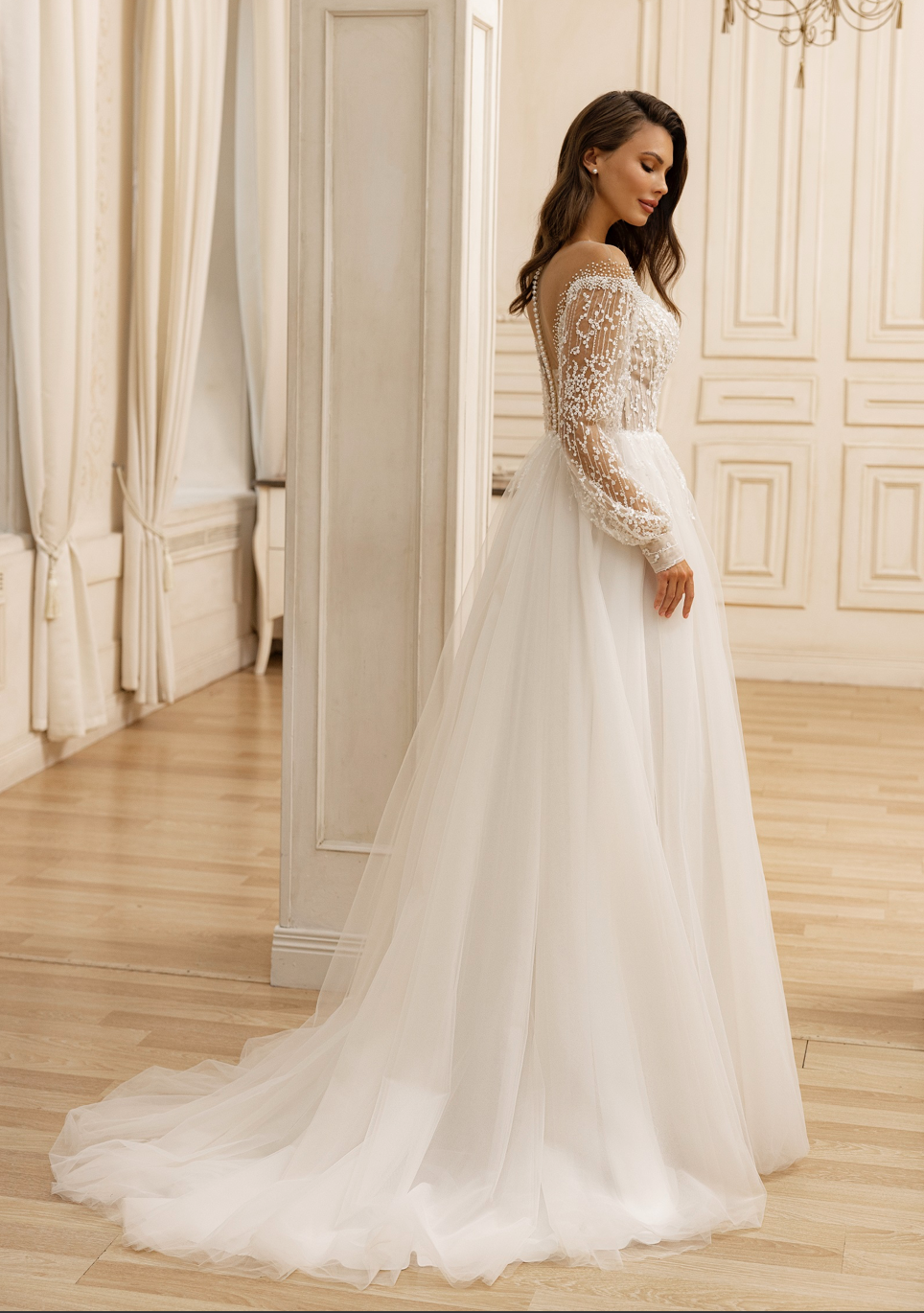 Krajkové aplikace zdobí dlouhé, průsvitné rukávy a dodávají designu královský nádech.