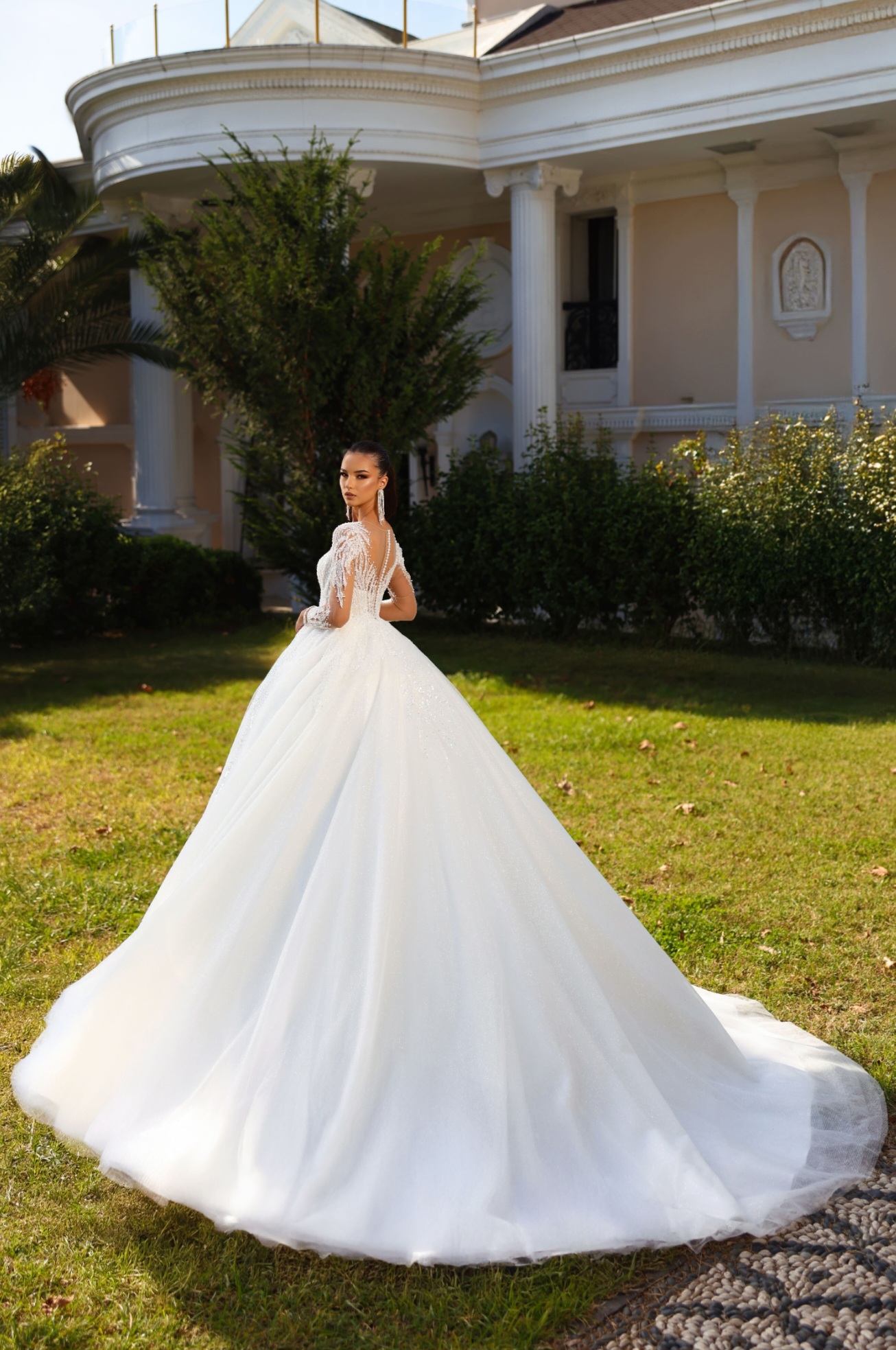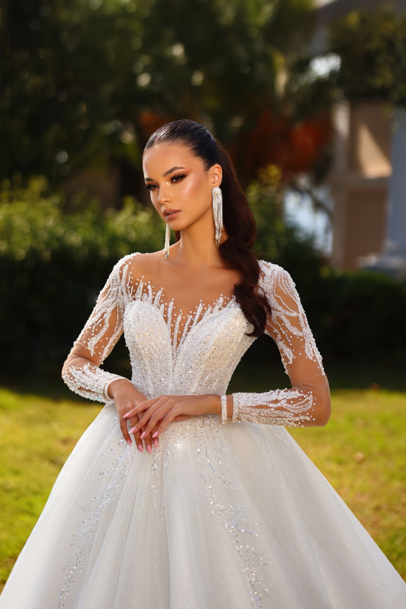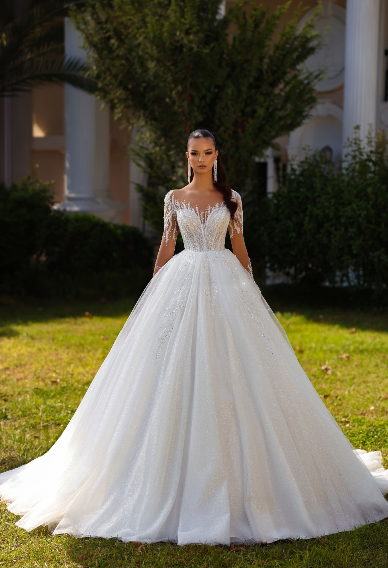 Luxusní třpytivá krajka s korálky zajímavě dotvářející dekolt a elegantně zakrývající paže . Celý luxusní dojem šatů dotváří velmi bohatá,třpytivá sukně se zdobením a vlečkou. Záda jsou v originále na knoflíčky,ale na přání můžeme ušít na šněrování.