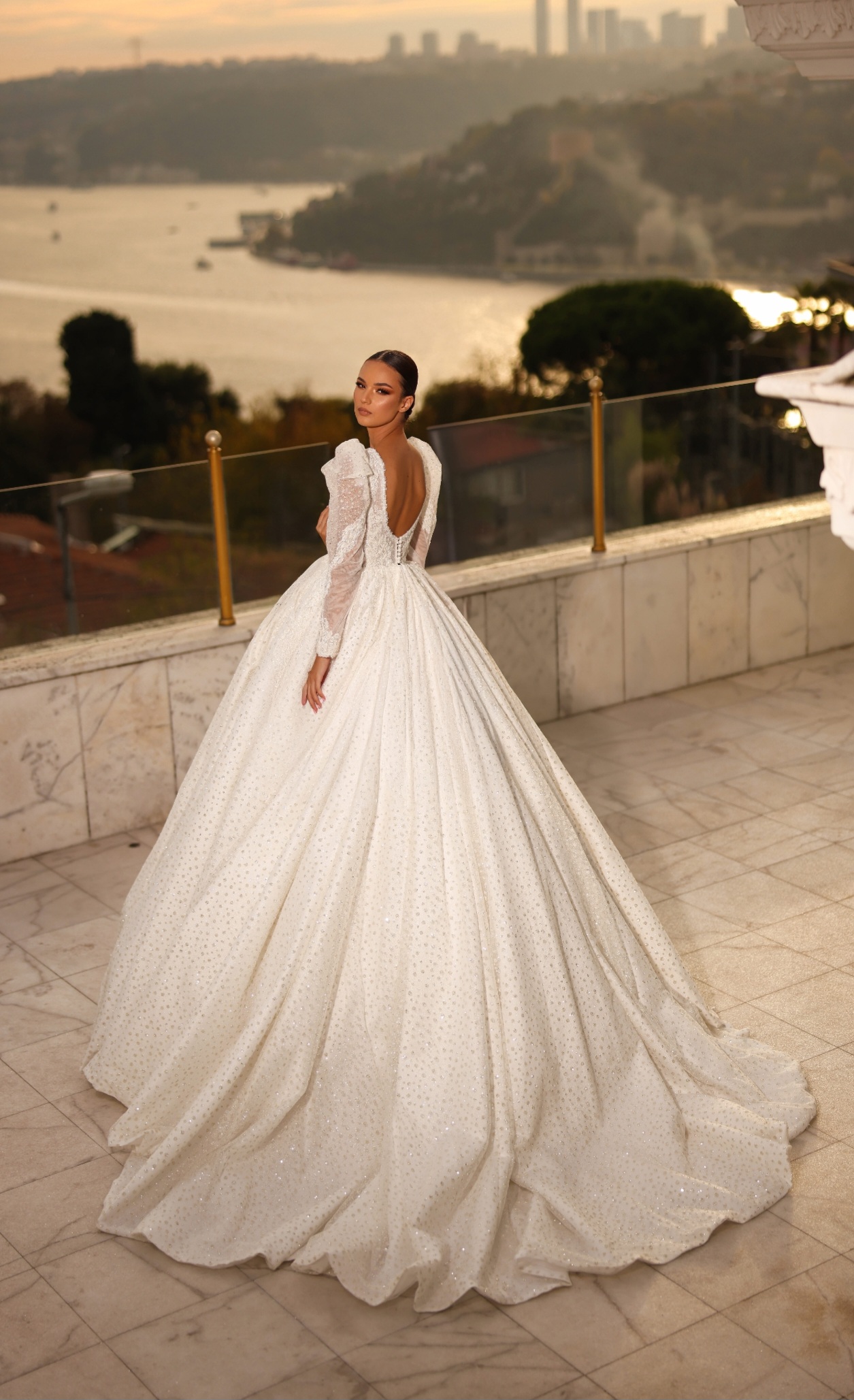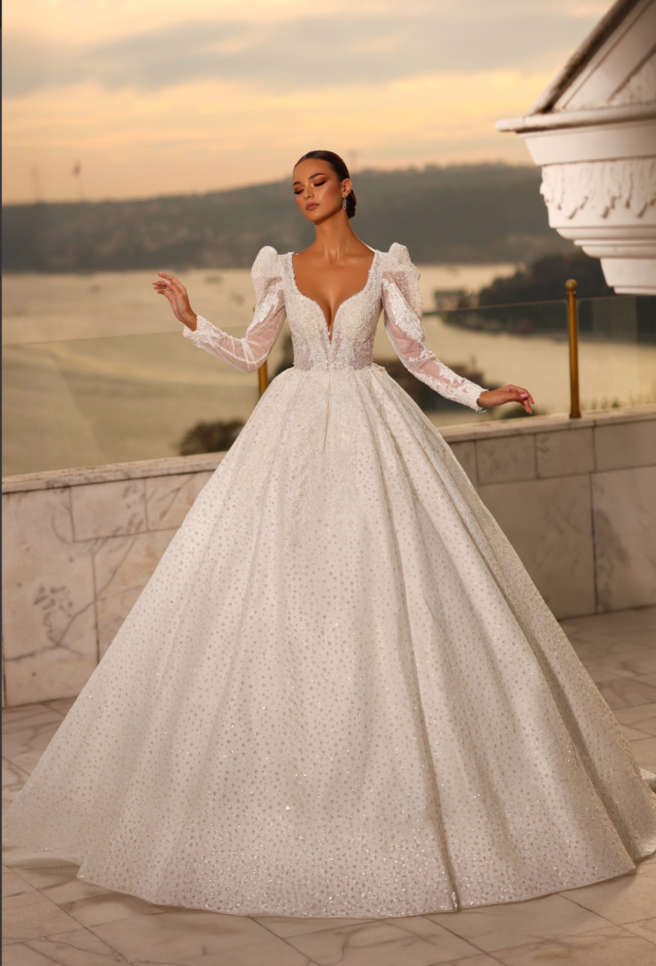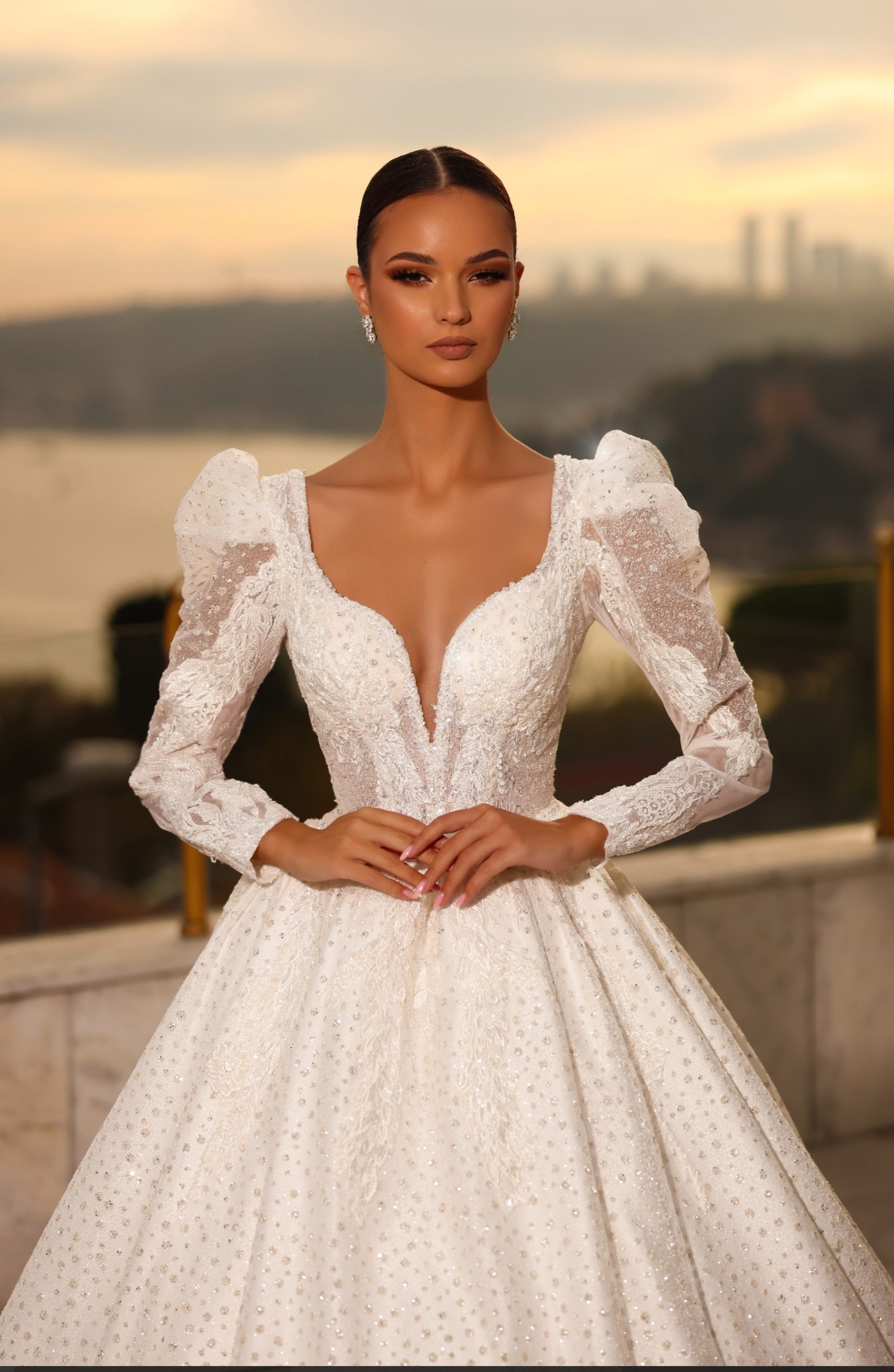 Královské svatební šaty , které mají nabírané dlouhé rukávy a něžný tvar dekoltu. K tomu bohatá dekorovaná sukně s vlečkou.
