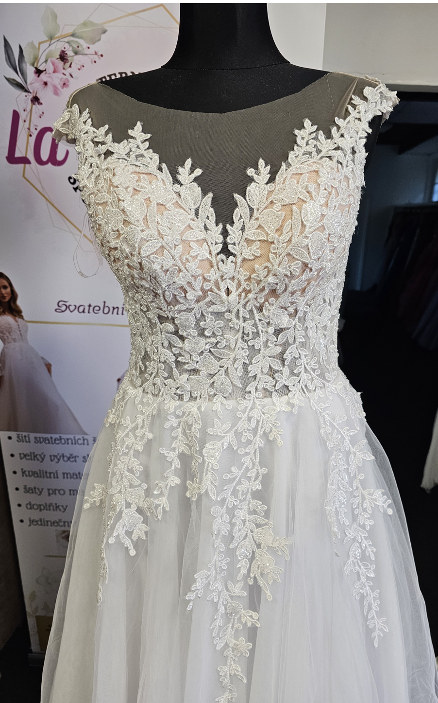 Tyto svatební šaty jsou ve střihu A - linie s lehce princeznovským dojmem s jemnou a romantickou estetikou . Sukně je tvořena z několika vrstev tylu , což jí dodává objem a vzdušnost bez toho, aby působila těžce. Živůtek je nejvýraznějším prvkem. Je zdobený výšivkou připomínající pírka nebo listy. Toto zdobení vytváří várazný tvar hlubokého výstřihu do V. Celkově jde o velmi elegantní , moderní a romantické svatební šaty ze svatebního salonu La KlauMa.