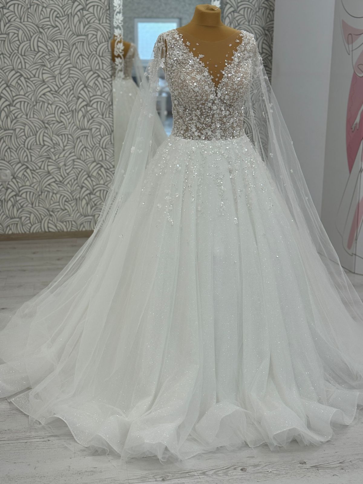 Vstupte do nadčasové krásy svatebních šatů ze svatebního salonu La KlauMa ve svůj velký den. Velmi výjimečné svatební šaty. Třpytivý živůtek, zajímavé rukávy a nádherná trpytiva sukně.